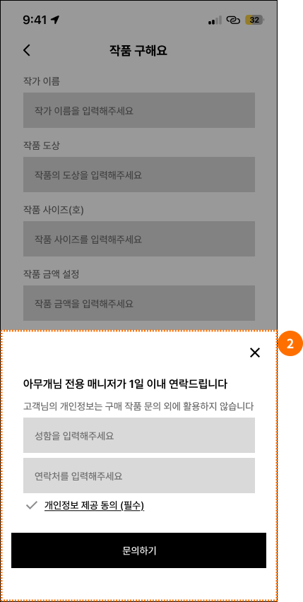 - "고객님의 개인정보는 구매 작품 문의 외에 활용되지 않습니다."